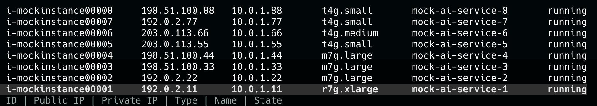 --query 'Reservations[].Instances[].[InstanceId, PublicIpAddress, PrivateIpAddress, InstanceType, Tags[?Key==`Name`]|[0].Value, State.Name]' \