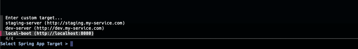 selected_target=$(printf "%s\n" "${targets[@]}" | fzf --prompt="Select Spring App Target > ")