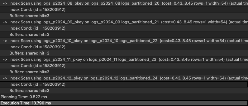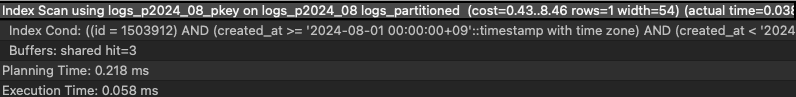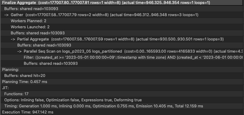 - Parallel Seq Scan on logs_p2023_05 logs_partitioned: Partition pruning is functioning