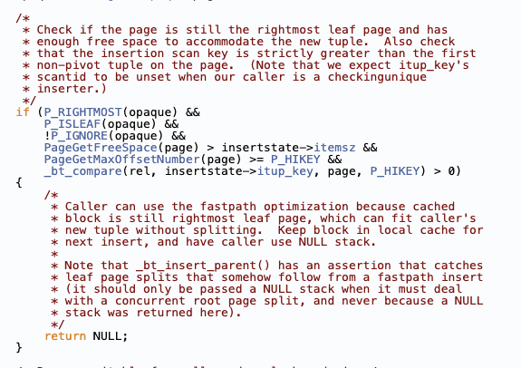 - It checks if the page is still the rightmost leaf page, if there is enough space to insert the new tuple, and if the key being inserted is greater than the highest key on the page.