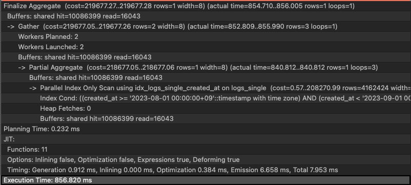 - parallel index only scan: Reads from the index without reading the table body, completed by 3 processors (1 main, 2 workers)