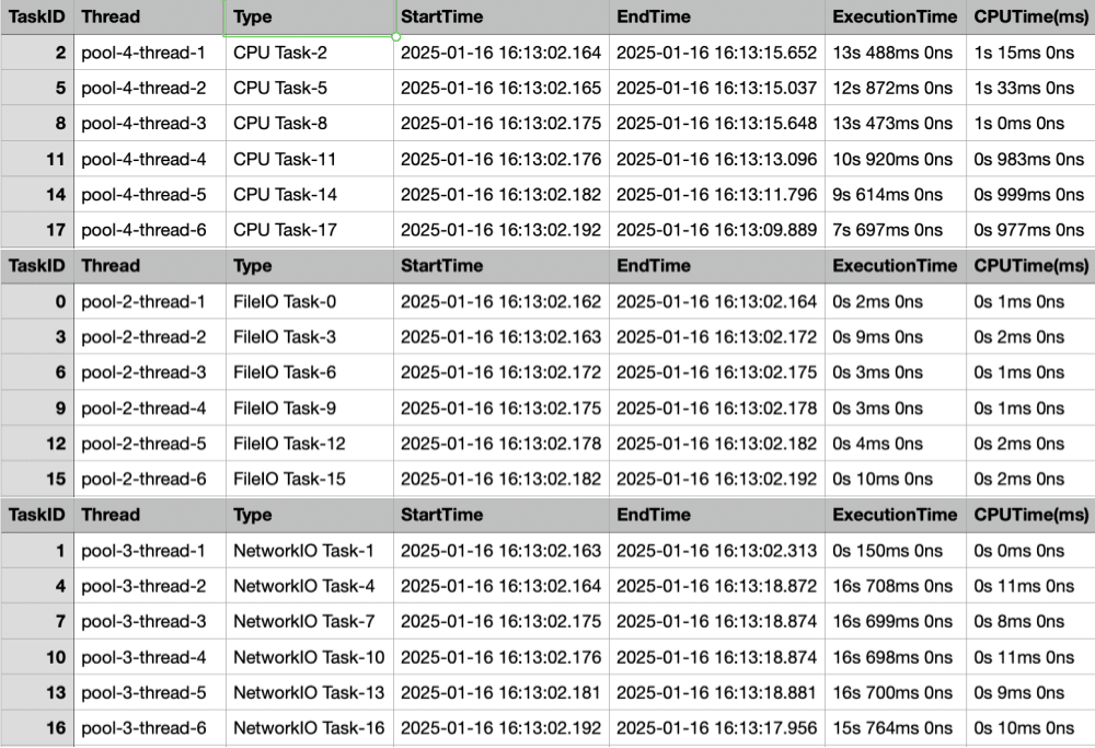 TaskID: 18, Type: FileIO Task, CPU Time: 13 msOn average, more time was spent than with multiple thread pools,