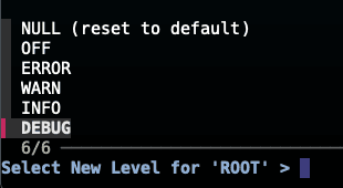 local levels="DEBUG\nINFO\nWARN\nERROR\nOFF\nNULL (reset to default)"