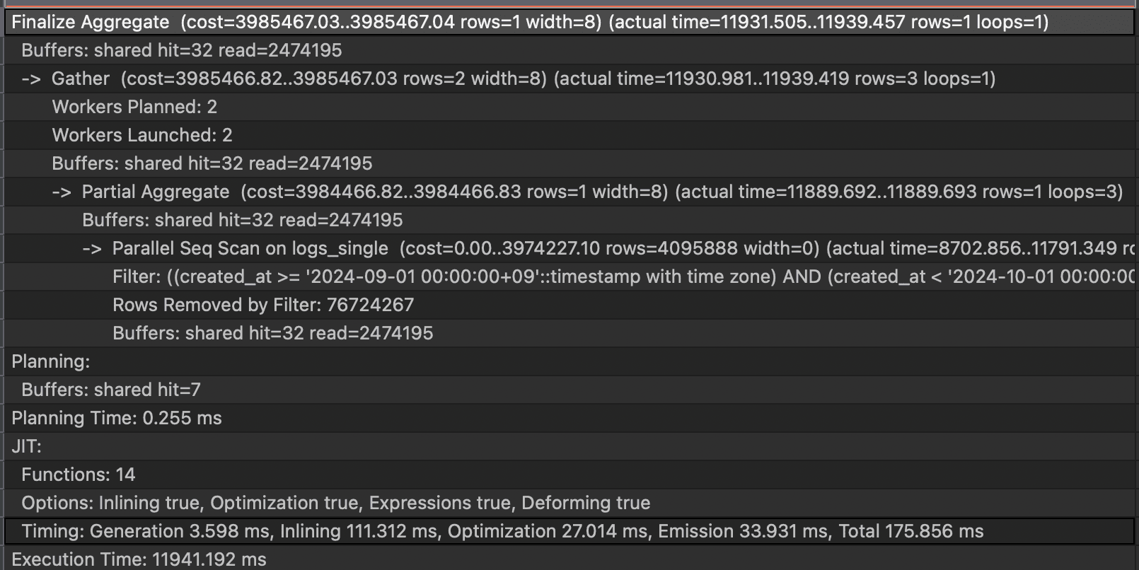 - Parallel Seq Scan on logs_p2023_05 logs_partitioned: Partition pruning is functioning