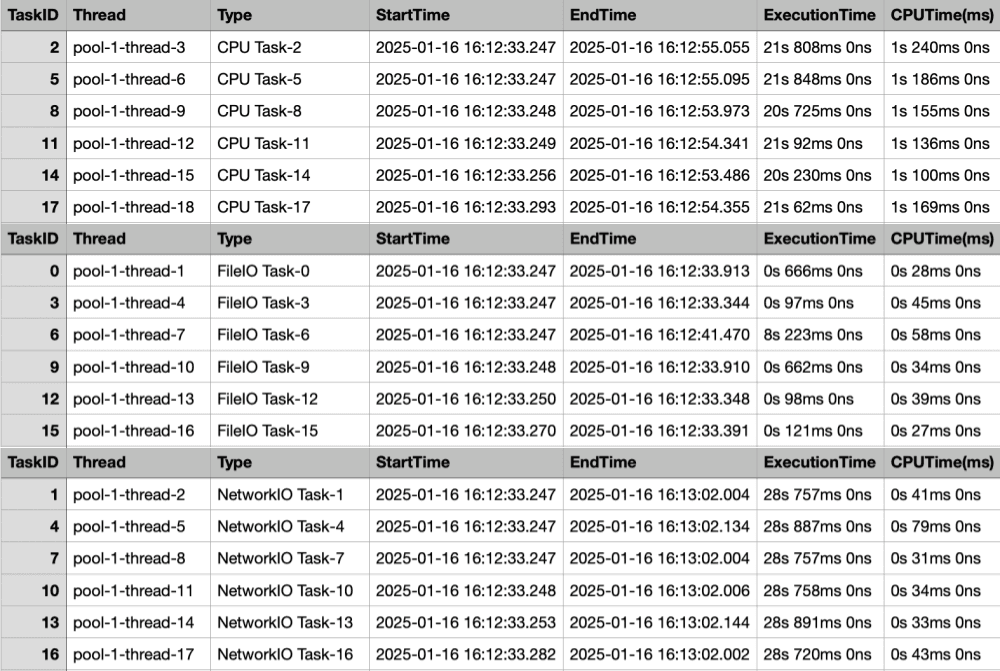 TaskID: 45, Type: FileIO Task, CPU Time: 3 msThe max ~ min time for each task is also relatively uniform.